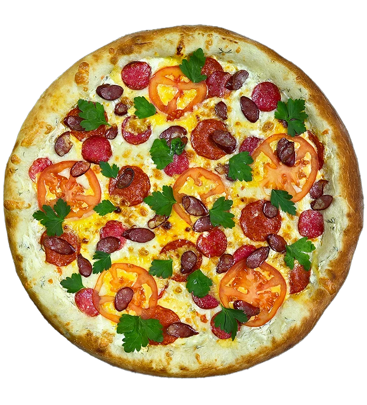 Сыр, соус белый, салями, чоризо, сыр чеддер, помидор, охотничьи колбаски, петрушка. Вес - 540 г.