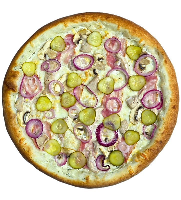 Сыр, белый соус, куриное филе, бекон, шампиньоны, огурец солёный, лук маринованный, специи. Вес - 580 г