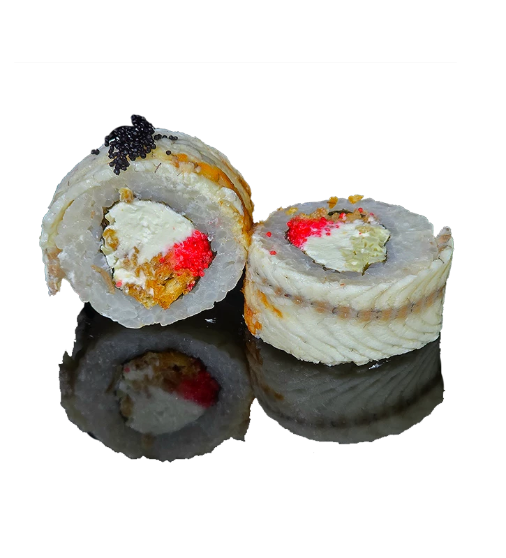 Нори, рис, угорь, сыр сливочный, томаго, лук фри, икра масаго, соус унаги. Количество - 8 кусочков. Вес - 250 г