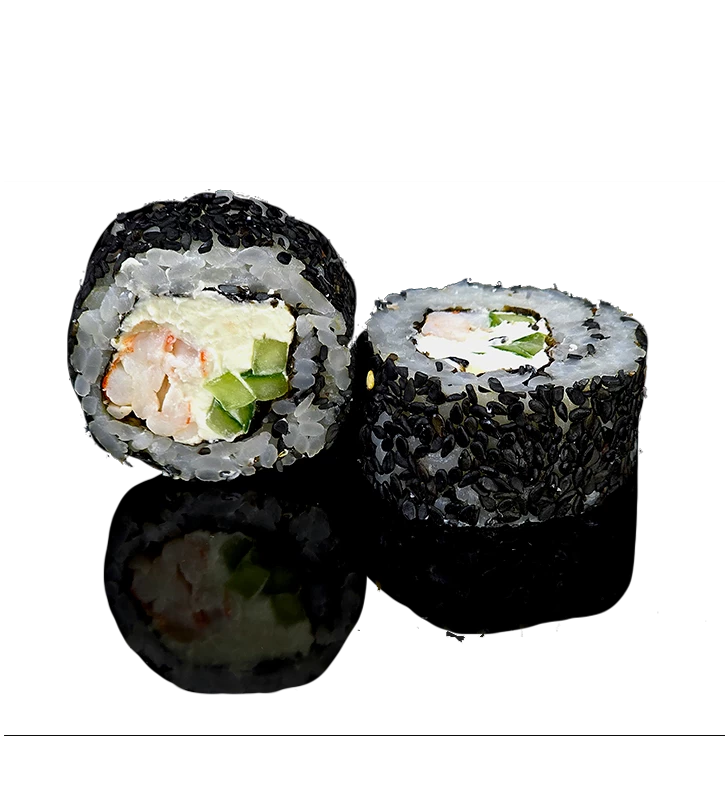 Нори, рис, сыр сливочный, огурец, креветка, кунжут. Количество - 8 кусочков. Вес - 220 г.