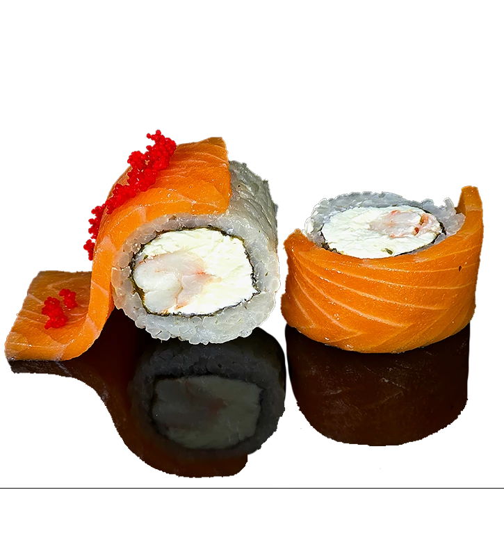 Нори, рис, сыр сливочный, креветка, лосось, икра масаго, соус тайский. Количество - 6 кусочков. Вес - 260 г
