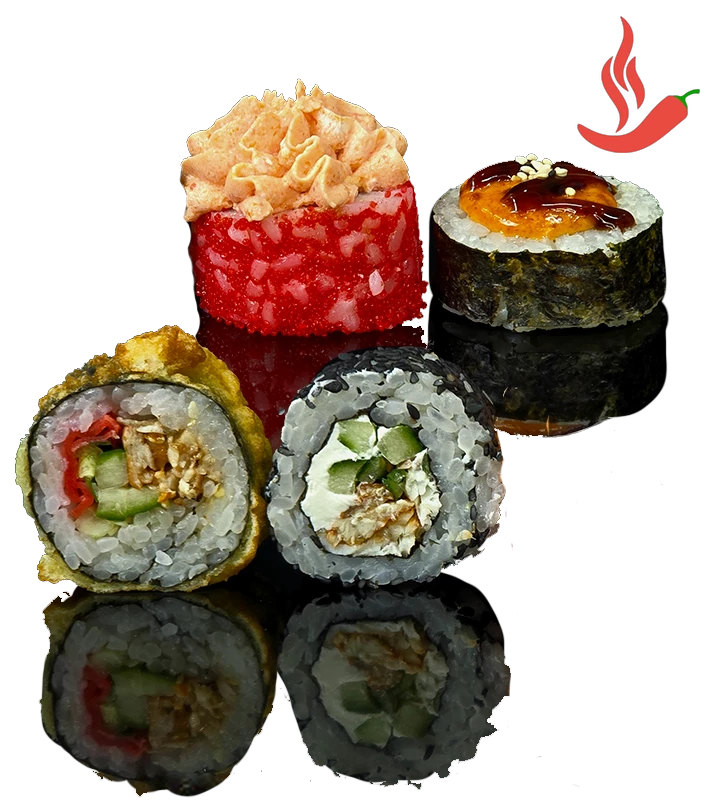 Состав: ролл "Запеченный футомаки с угрем", ролл "Темпура с угрем", ролл "Нежная калифорния с угрем", ролл "Фила с угрем" Количество - 36 кусочков. Вес - 950 г.